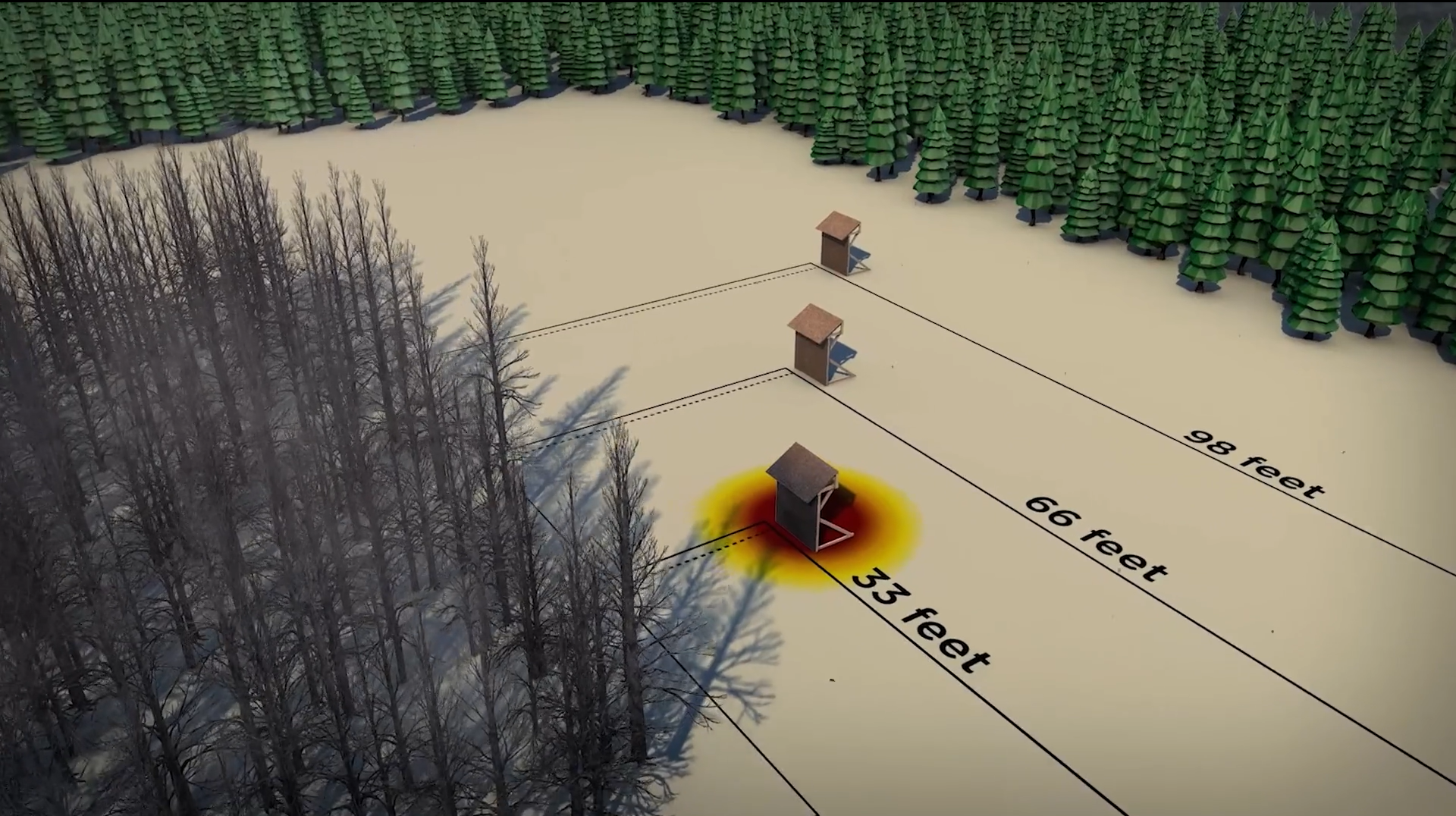 In 1997, Jack carried out an experiment in which he ignited several blocks of boreal forest next to wooden structures that were placed at 33 feet, 66 feet, and 98 feet away from the flames. The structure at 33 feet ignited on all sides, but the structure at 66 feet was only charred on one side.